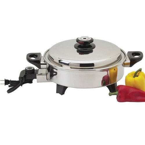 - This 120v, 1650 watt, 3-ply skillet features low dome cover, stay-cool handles and knobs and mirror finish for beauty and durability.